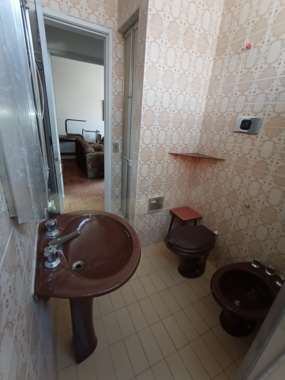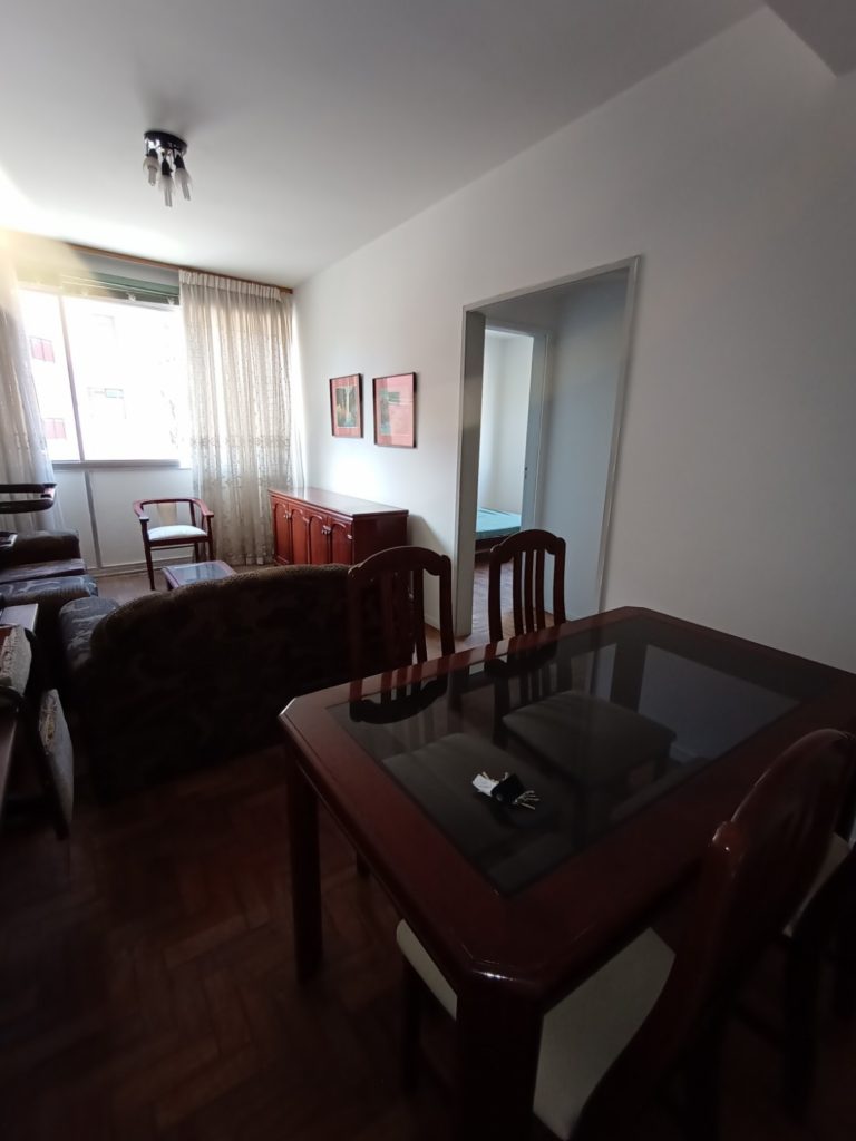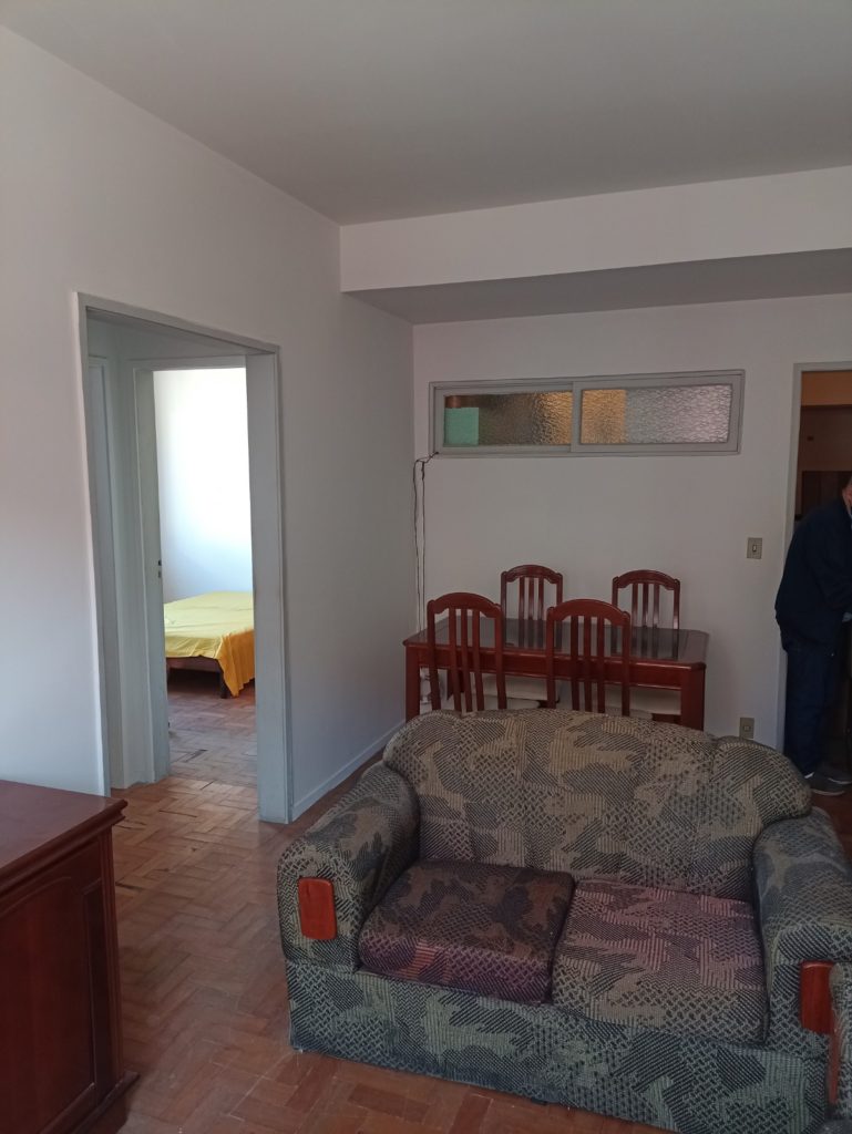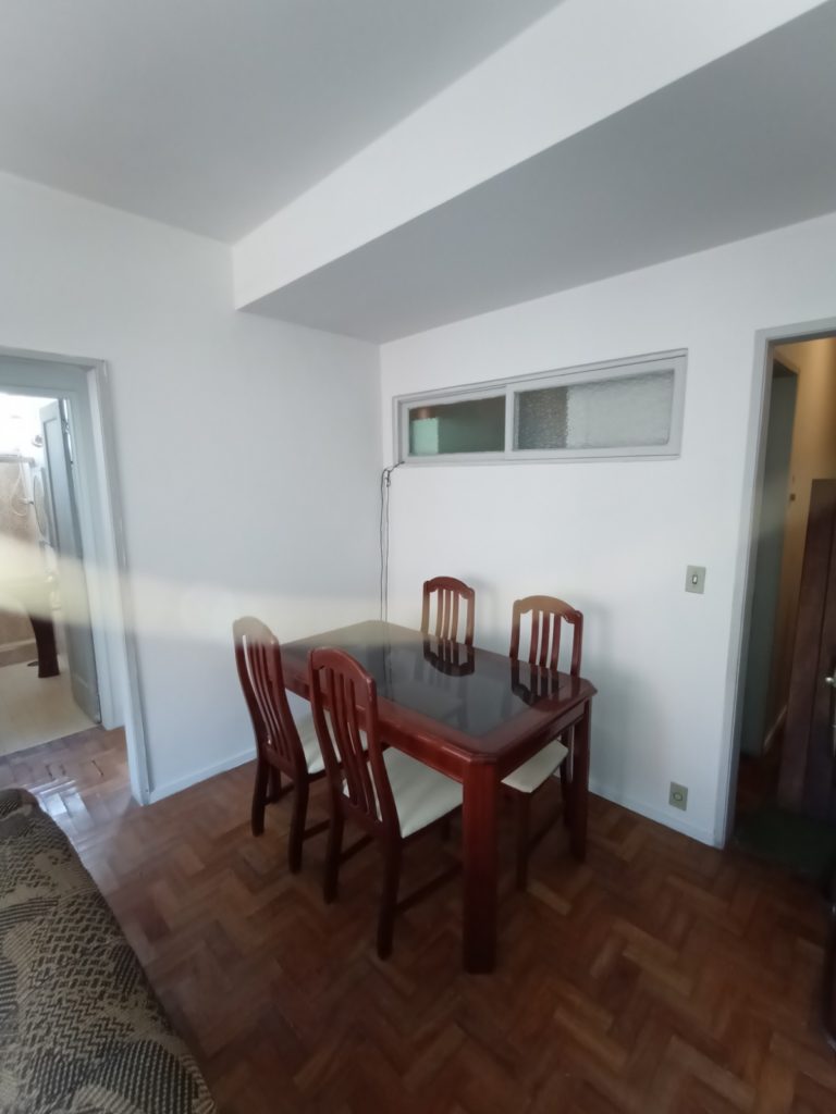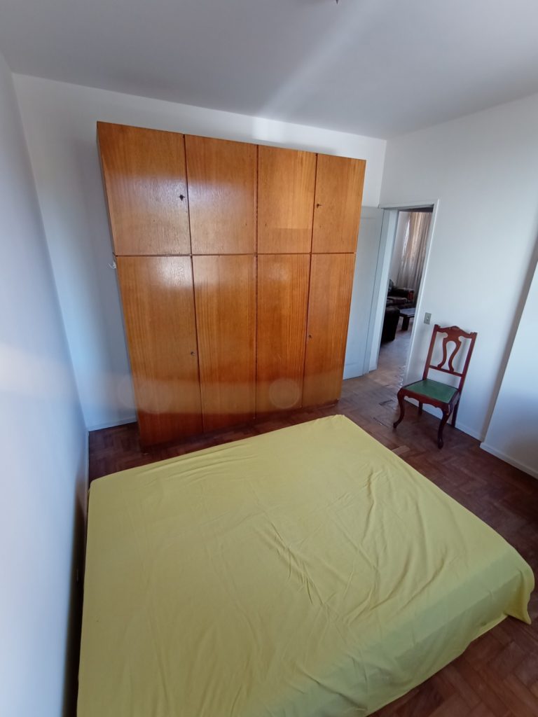 Apartamento no primeiro andar, com dois quartos, sala em dois ambientes, banheiro social, cozinha, área de serviço, WC e quarto de empregada. Uma vaga de garagem